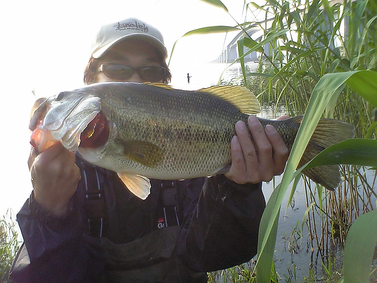 サカイ君キャロ一投目、着水ワンアクションで「きたー!」管理人「ほんとに魚か?(信じたくない管理人(^^;)」サカイ君のシロパヤテが良い感じでしなっている。バスが水面に出た瞬間、管理人「50あるね、いいなー(^^;」サカイ君51センチGET!凹む管理人。