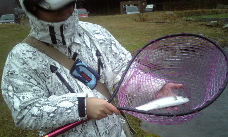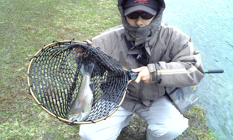 先に準備を済ませたヤスダ君が管理人を置いて釣り開始し(^^;出遅れた管理人もすぐにヤスダ君のもとへ・・・・、すると、ヤスダ君がネットをさしだす・・・・マス君が入っている(^^)え?もう釣れたんかい?(^^;