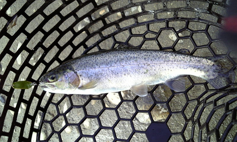 と言うことで、午後から北方管理釣場に行って来ました。平日なのにわりと人が多いです・・・(^^;どこにはいろっかな〜・・・空いているのはネットとネットの間辺り・・・しゃーないわな〜(^^;釣れないなりにも頑張りますか(^^;