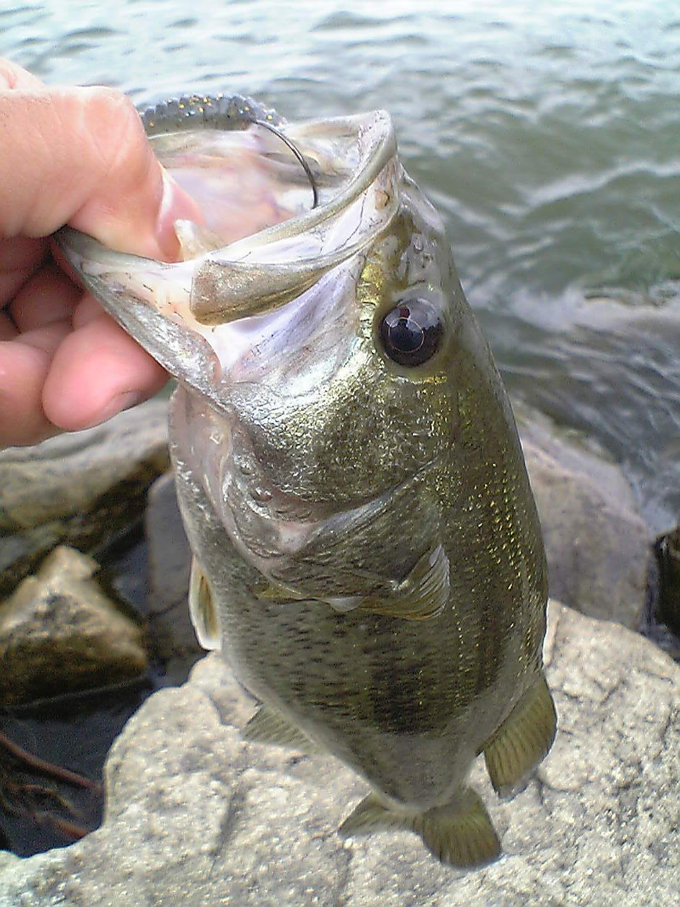 管理人はJH、ネコ君は生ウオデスなどで様子見・・・しばらくあたりがなく場所を変えながらやっていると、管理人のJHに「コン」と、小さなアタリが・・・フッキング!・・・あら、小さい・・・(^^;上がってきたのは30UPのバス君でした。