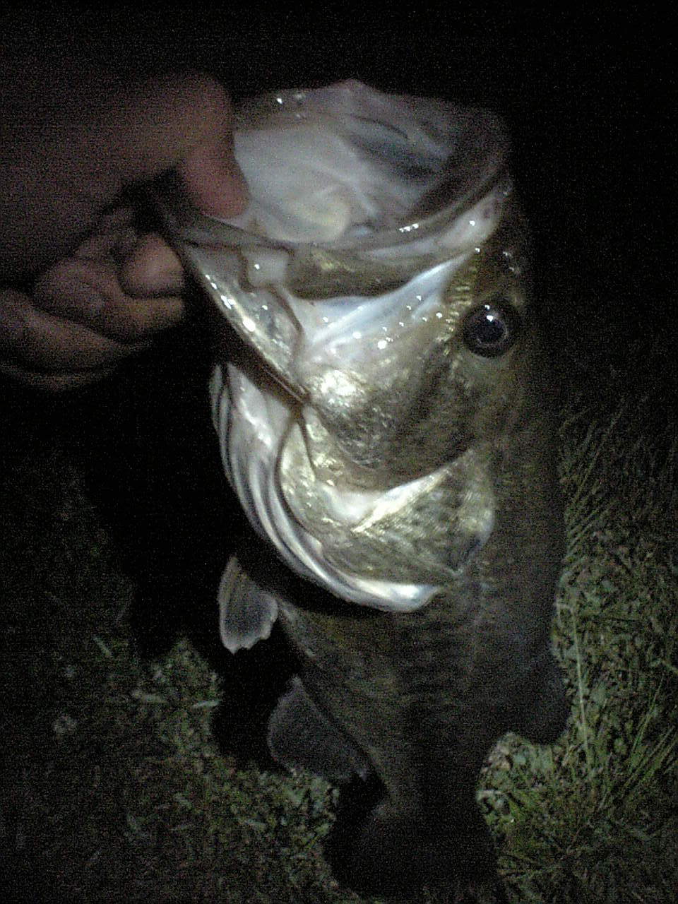 そして、数投後・・・ロッドがかすかに「ヌー」と動き、きちゃった?とぉーう!フッキング!おおぉ!この重量感・・・・、沖でジャンプしたバス君を見て・・・50ある・・・(^^;ライン結びなおしてない・・・・(^^;