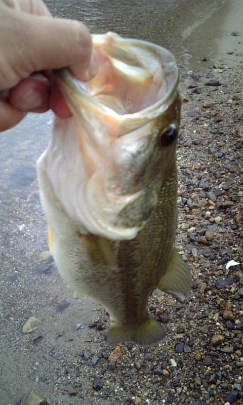 この辺一帯はウィードがバラバラ生えている感じで、あんまり釣れそうではない・・・(^^;所々でギルバイトがある・・・しばらくすると岬で釣っている人が40ぐらいのバス君をつっとるやんけ(^^;いいなぁー・・・・