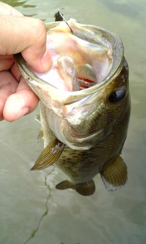 ギルバイトのあった所を重点的にキャスト、するといきなりロッドをひったくられるアタリが!きたー!フッキング!・・・40あるか?・・・ウィードにもぐられまくりましたが、フライトフリップなので強引に引きずり出しキャッチ・・・・あら、思ったより小さい(^^;30upかぁ・・・・はぁ・・。