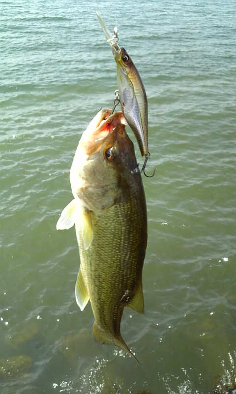 やるだけやるかぁ(^^;よし、ヤマセン5で勝負じゃ!前回とは違って、とても穏やかな琵琶湖なのでスローにウィードに絡めてボトムを引く。