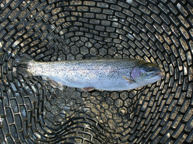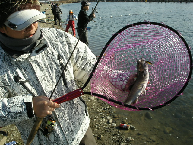 そんな感じで横を気にしていると、管理人にも強烈なバイトと同時にドラグが出るぅ!!一気下流方向に走るマス君・・・・きゃ〜〜!!スレがかりはいやだぁ〜〜!(^^;と管理人も、すいませ〜〜〜ん!と言いながら、隣の釣り人を4人ほどパスして下流に下る・・・(^^;なんとか確保(^^;ご迷惑をおかけしました・・・(^^;