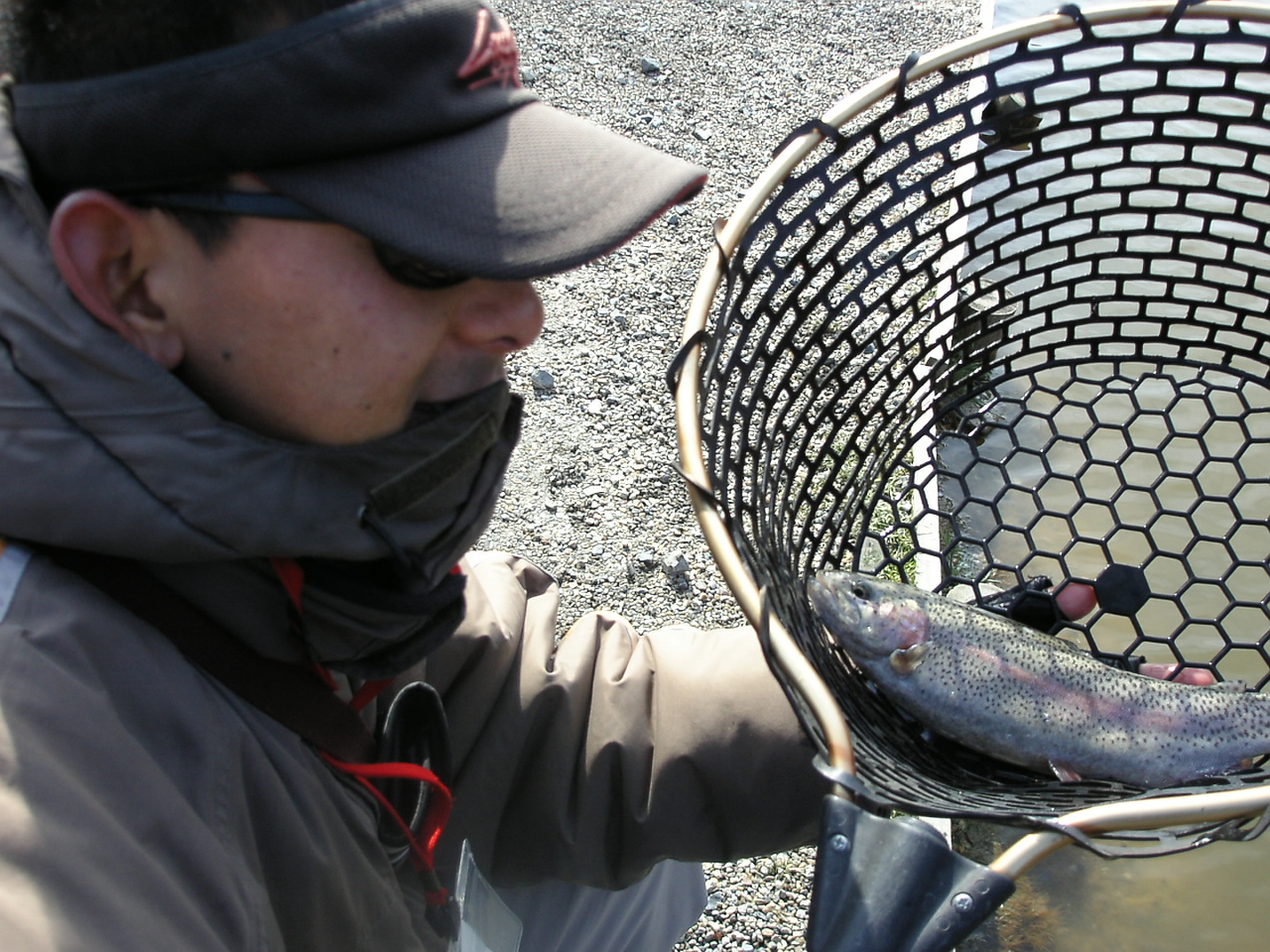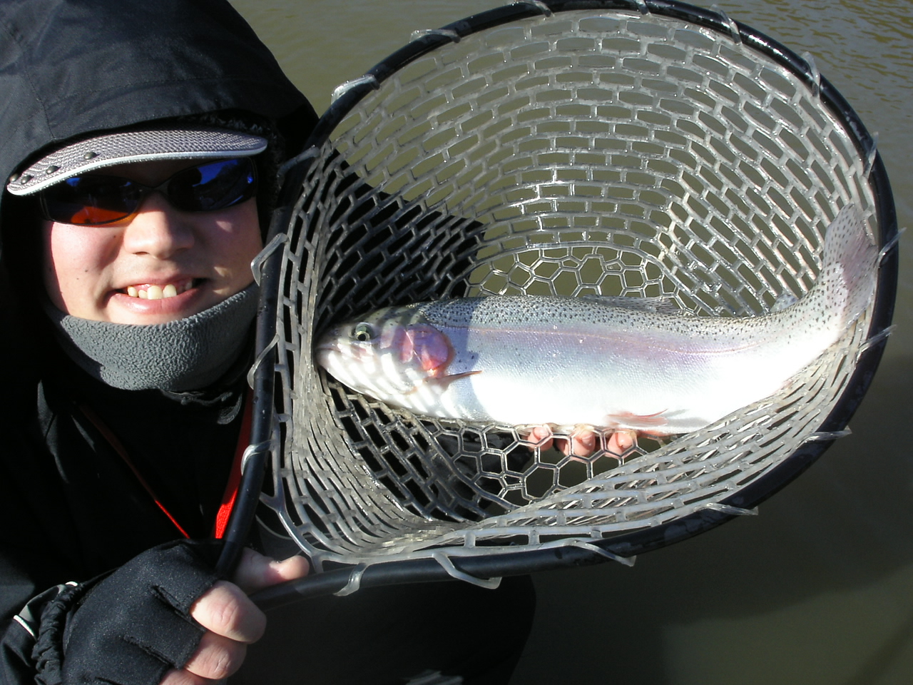 あら?デカイ(^^;しょうがないので、すくって上げようと・・・ざば〜っとやると、あ、ごめ〜んすくいそこなった(^^;その反動でネットが管理人のロッドに絡み、手こずっていると・・・ビニ君が・・・・そりゃね〜っすよ〜(^^;と、自分ですくってました・・・あ〜あ、俺の出番が・・・・。