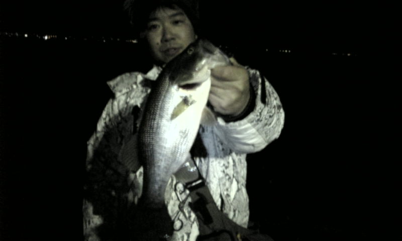 2:30におの浜到着。先行者3名、管理人はヘビダンをリグっていると、ヤスダ君はJHを先にキャスト・・・「あ、アタった」・・・フッキング!ファイト突入(^^)