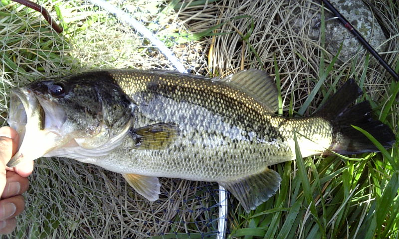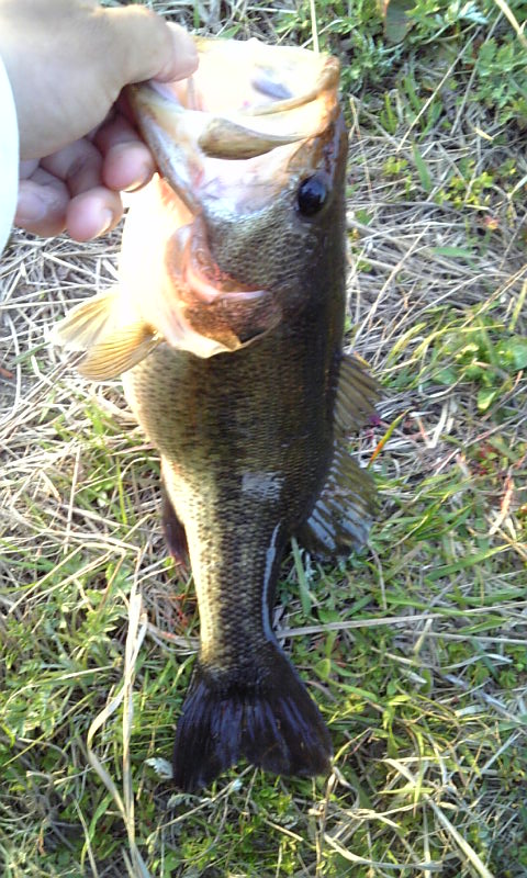ギルアタリがポツポツある・・・・・。数投後・・・キャストしてボトムに落ちてすぐウィードの塊に絡んだのを「もさぁ〜ぷる〜」っと外したら・・ゴ、ゴン!きたきた〜(^^)