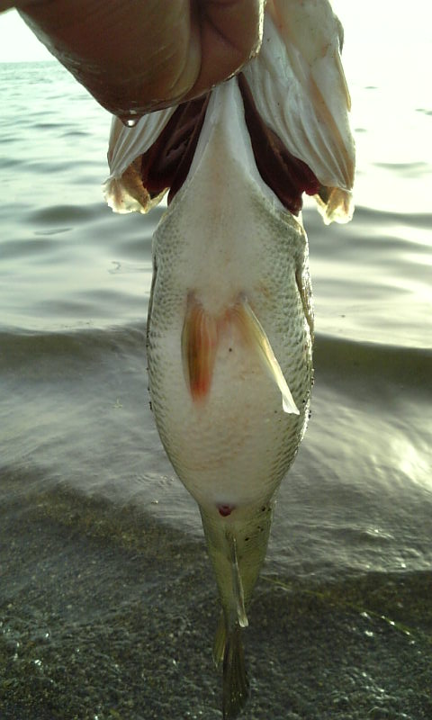 でもデス6のお腹はガサガサになっている・・・。その後はバイトがなかったので、バイブレを投げて沖目を探る・・・・沖も岩がゴロゴロしとるな〜・・・所々にエビモがチョロチョロっとある。
