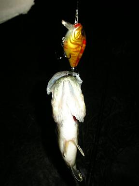 スタッガーを流した後、戻りながらお気に入りのGUNクランクを流していくと、こんなのが3本釣れました(^^)コバスはスコブル元気?