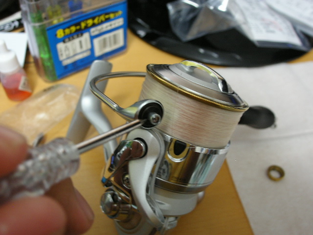 注意:(ネジに緩み防止剤?が塗ってあるので多少硬いです。運悪く緩み防止剤が多めにつけてあったりすると、硬くてベールの受け側がワレルそうなので無理そうなら止めましょう(爆) それと、エアベールは簡単に歪むので、エアベールには力をかけないでください!)